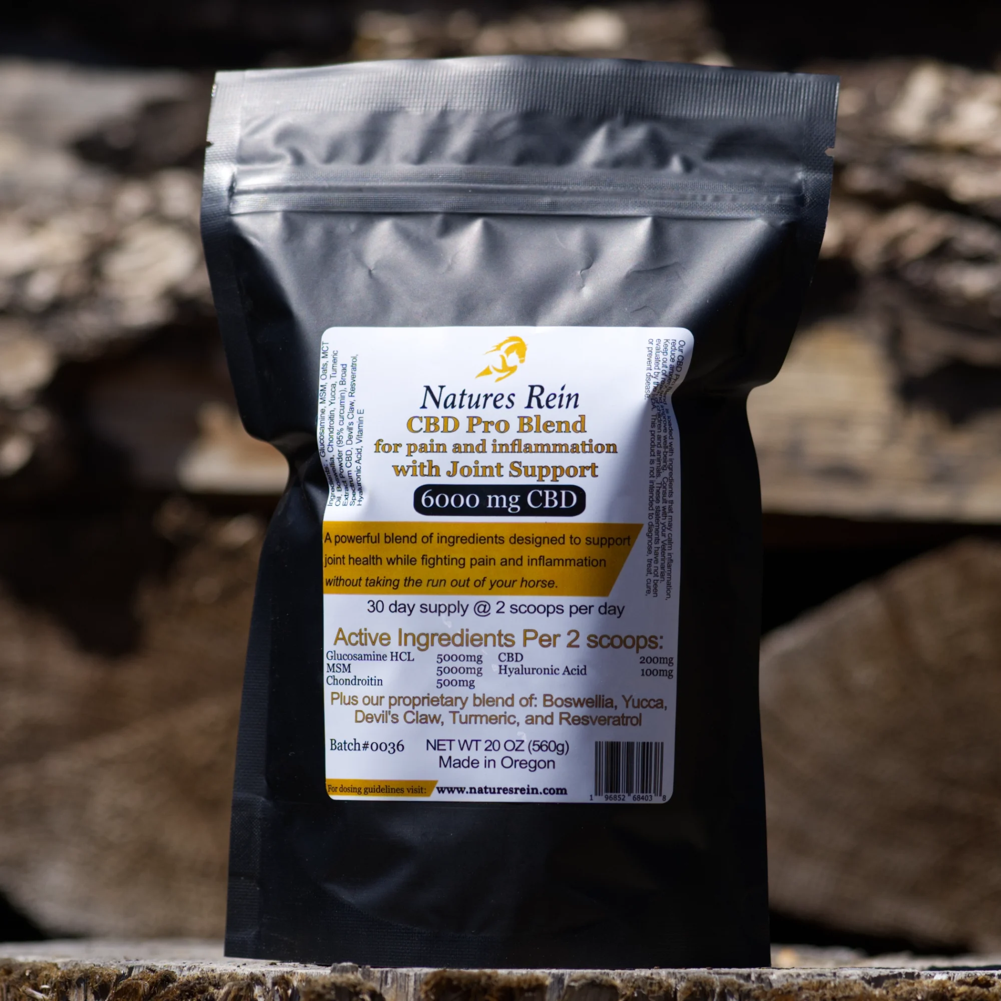 Each 30 day supply of Nature’s Rein CBD Pro Blend with Joint Support for horses starts with 6,000 mg of Broad Spectrum CBD (which is equal to our high dose equine tincture) and also offers a wide variety of other powerful ingredients for a true all in one supplement. Boswellia, Turmeric, Resveratrol, Devil’s Claw, and Yucca are added for fighting pain and inflammation, while Glucosamine HCL, MSM, Chondroitin, and Hyaluronic Acid are included for supporting joint health and mobility. CBD Pro Blend may promote quick recovery after strenuous activity or injury, help curb anxious behavior, and improve mobility with arthritic and older horses. All this plus 200 mg of Broad Spectrum CBD per serving makes our CBD Pro Blend with Joint Support a true cadillac among all in one equine supplements.